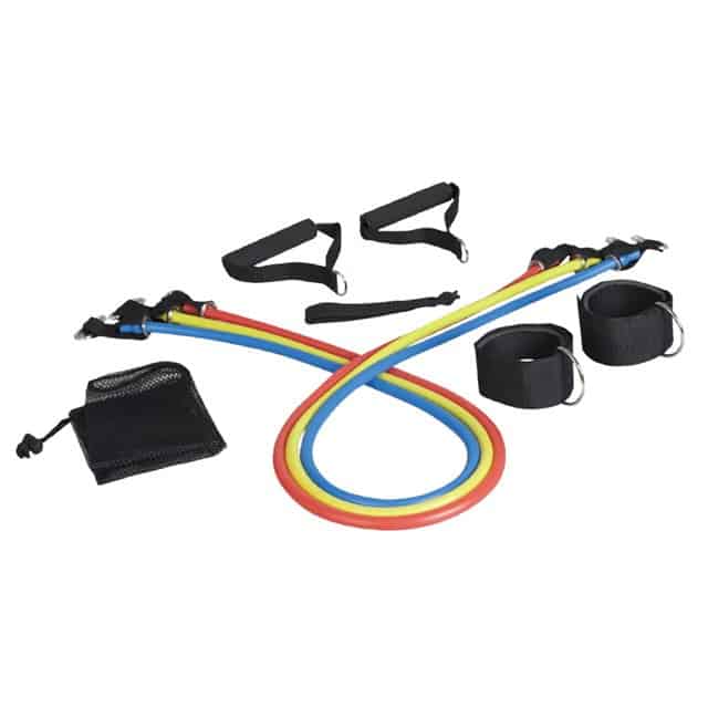 - Три трубчатых эспандера различной нагрузки с карабинами.